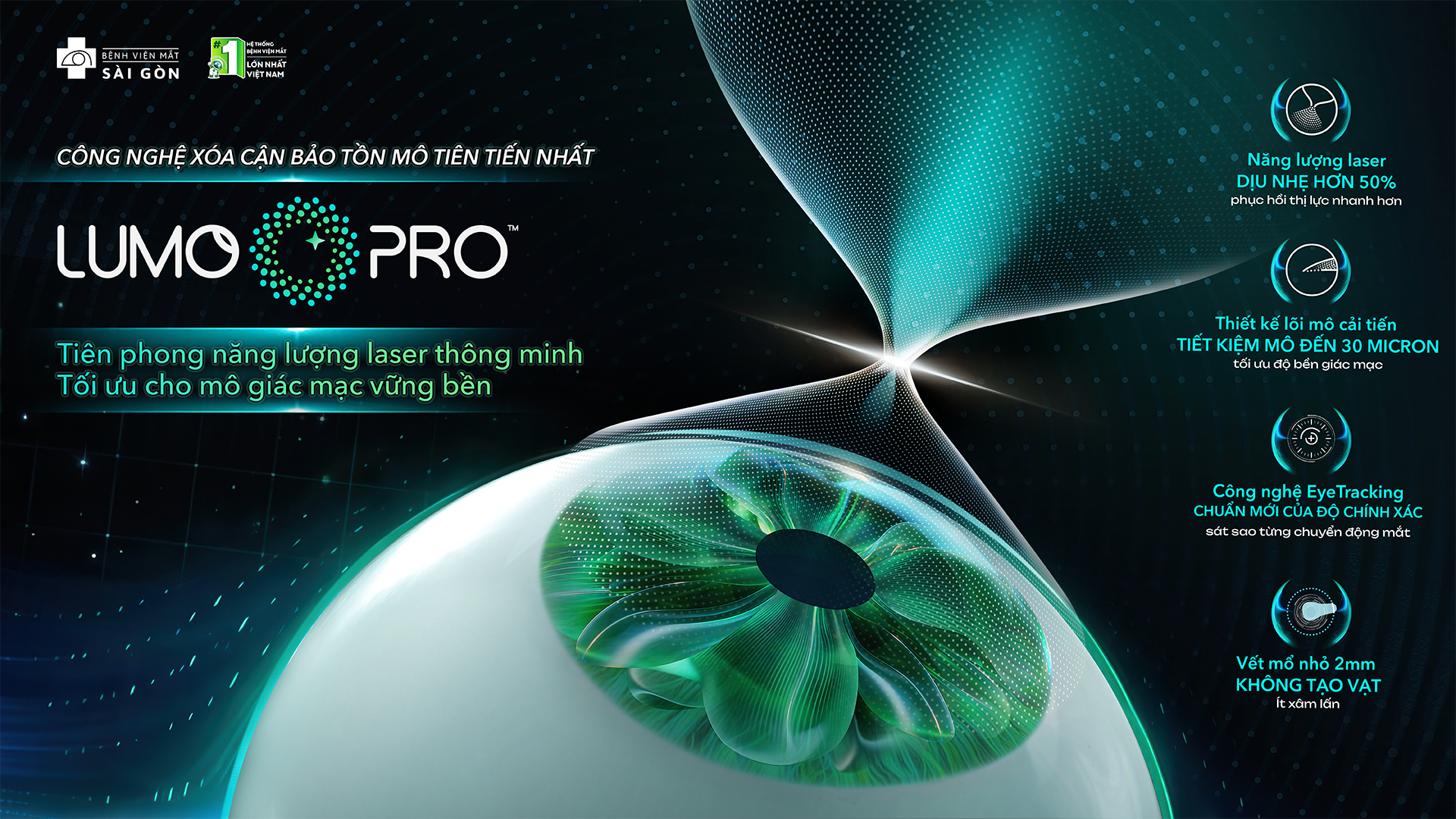 LUMOPRO™ sở hữu 3 ưu việt: Năng lượng laser thông minh, dịu nhẹ hơn 50%; Thiết kế lõi mô cải tiến tiết kiệm hơn đến 30 micron mô giác mạc; Hệ thống EyeTracking theo dõi mắt chủ động, tự động định tâm và trục thị giác, bù trừ những sai lệch khách quan nhỏ nhất trong quá trình phẫu thuật.